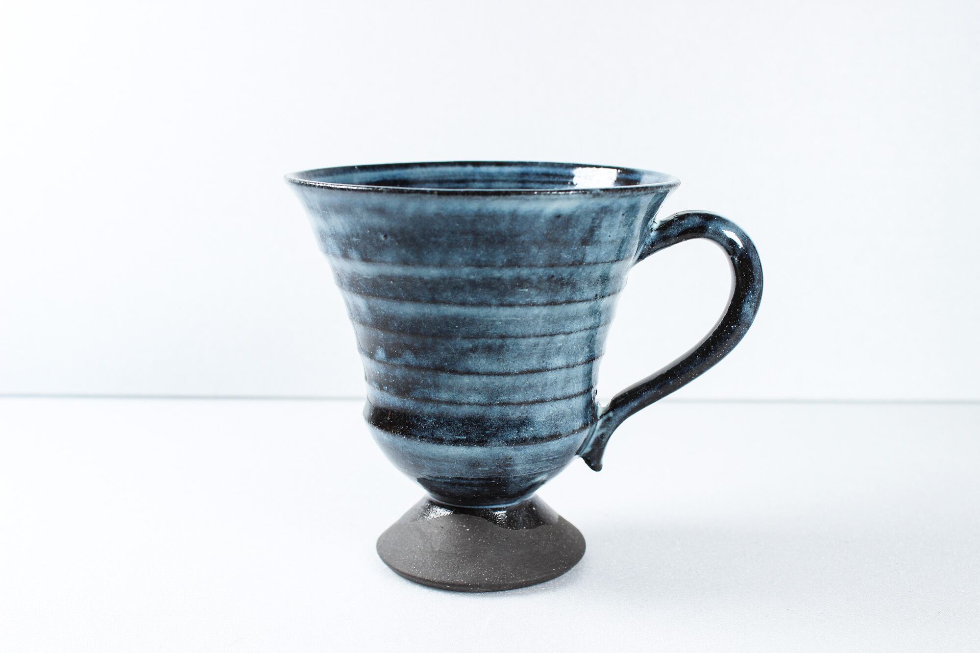 白藍釉の美しい色合いと独特な質感が特徴のゴブレットマグカップ(小)です。手作りならではの温もりを感じられるこのカップは、テーブルを華やかに演出します。