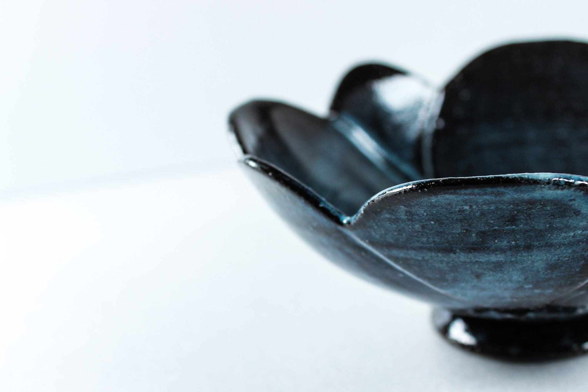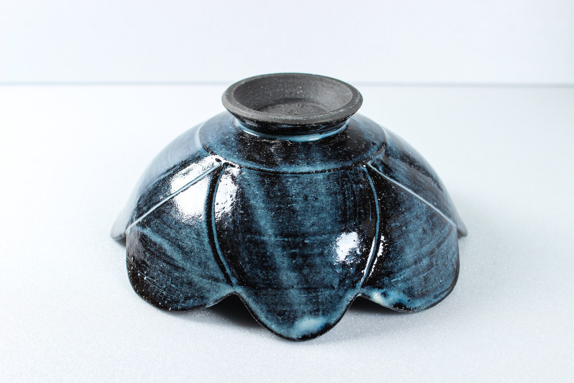 轆轤で成形した鉢を華の形に彫刻した足がついた鉢です。