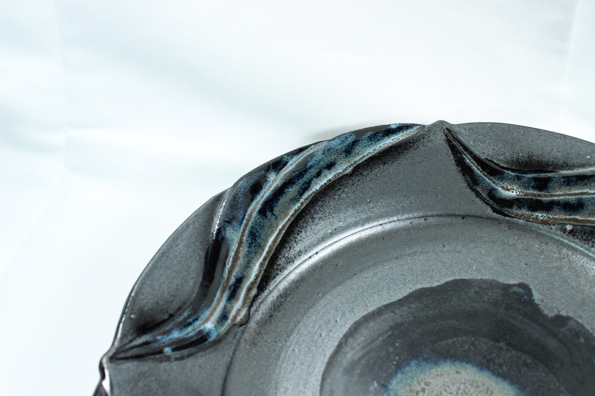 沖縄と熊本を繋ぐ想いで白藍釉と黒煌釉を掛け合わせて作った、銀河藍の8寸皿に銀河系の渦をイメージして波の文様を彫刻しました。