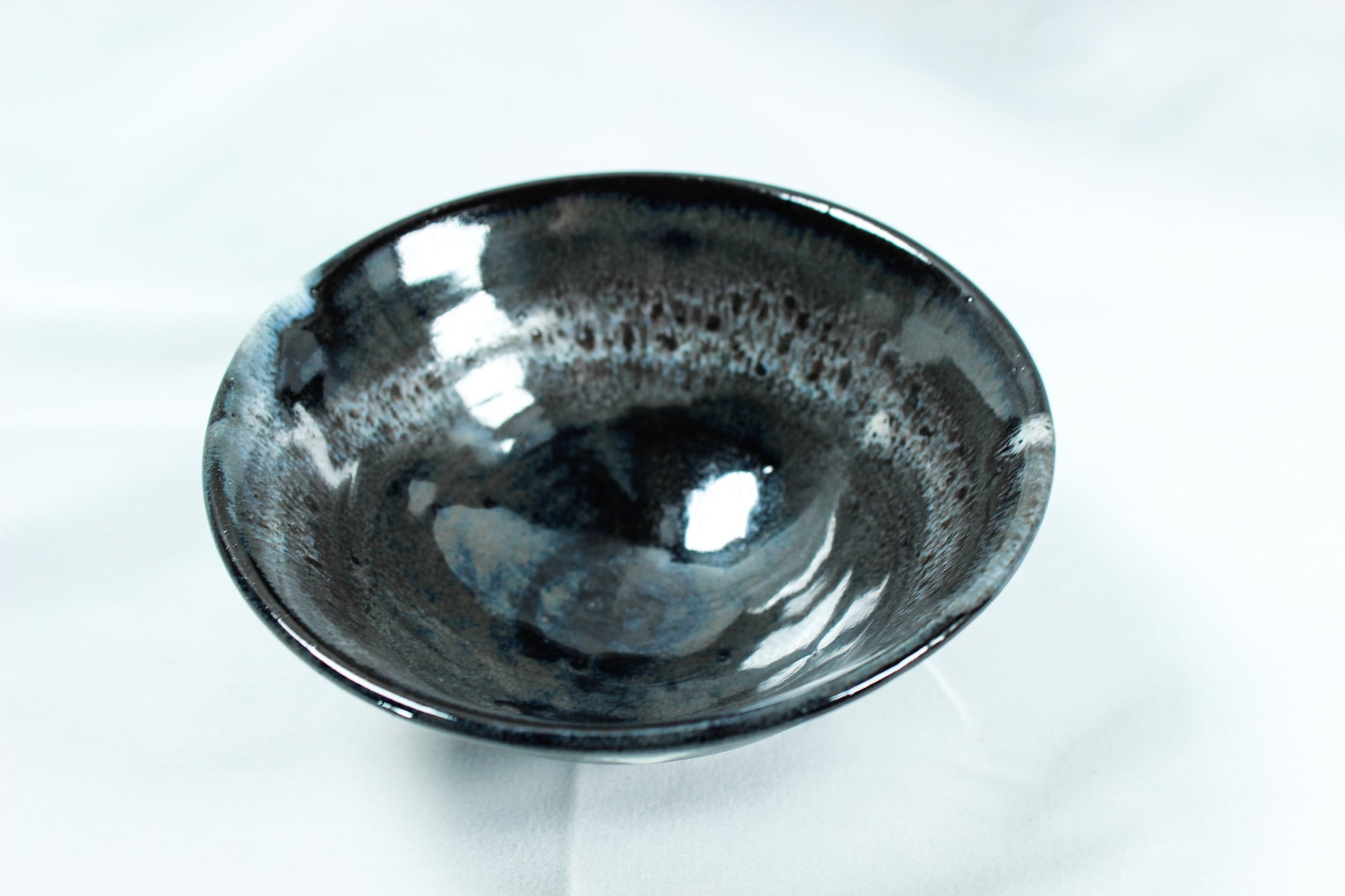 沖縄と熊本を繋ぐ想いで白藍釉と黒煌釉を掛け合わせて作った、神秘的な宇宙の輝きをイメージした銀河藍茶碗です。