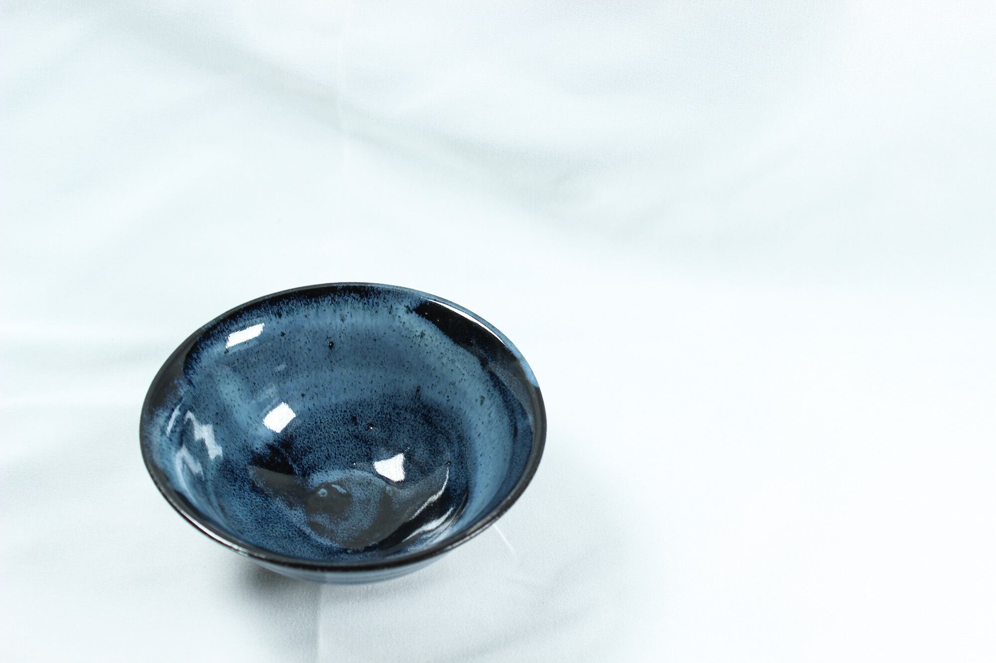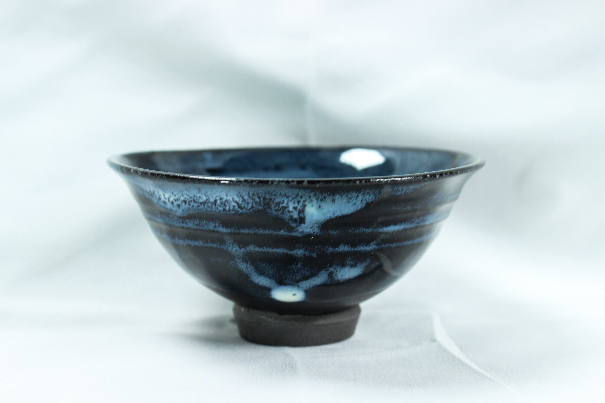 沖縄と熊本を繋ぐ想いで白藍釉と黒煌釉の基礎の黒釉を掛け合わせて出来た、深海に差し込む光のような藍色のイメージの深海藍シリーズのお茶碗です。